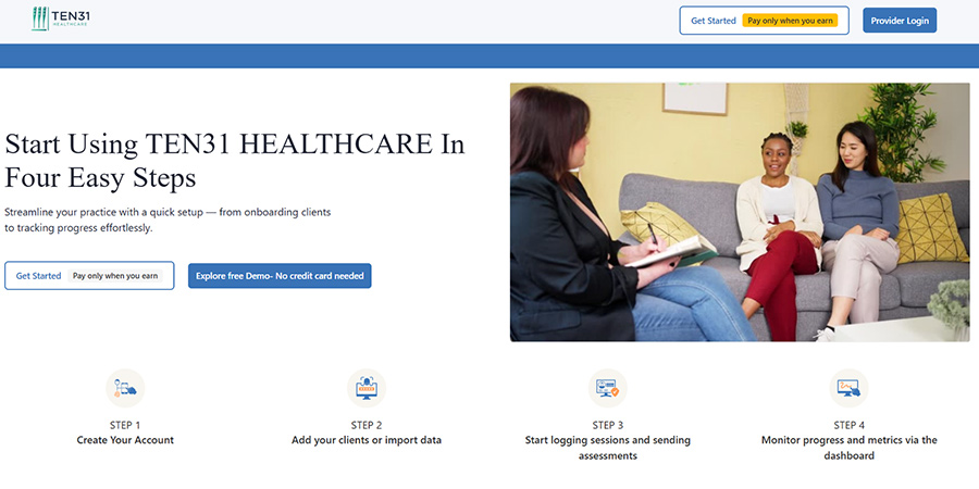 TEN31Healthcare makes it simple for providers to start and manage their practice in just a few steps. First, clinicians create their account and set up their profile. Next, they add clients or import existing client data to begin organizing their practice. Providers can then log sessions, send assessments, and track client progress through the platform. Finally, the dashboard provides clear insights and metrics, helping clinicians monitor outcomes and manage their work efficiently—all while paying only when the system is actively used.