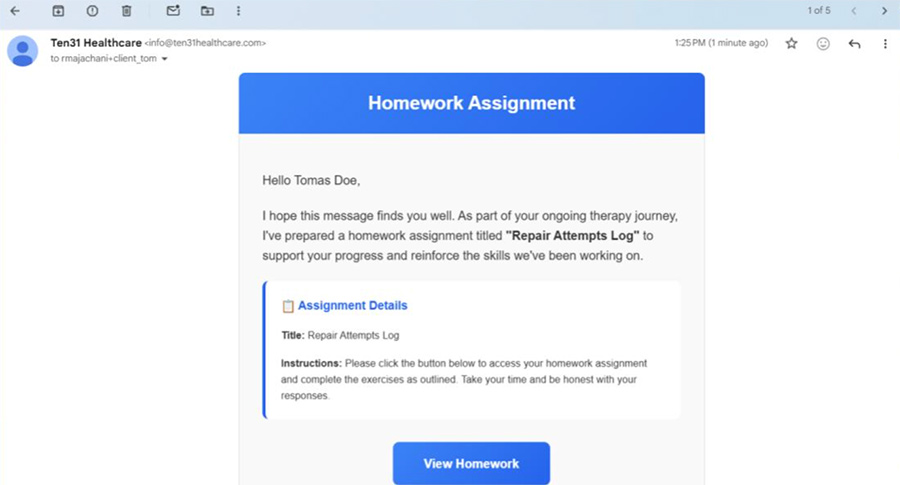 By integrating therapeutic homework into the care workflow, TEN31Healthcare supports a more collaborative and active treatment process, empowering clients to practice new skills while giving clinicians valuable feedback to guide future sessions.